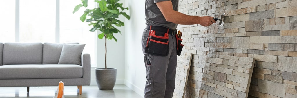 Επένδυση εσωτερικού τοίχου διαστάσεων περίπου 3×2,5 μέτρα στο σαλόνι με τεχνητή πέτρα. Η εργασία περιλαμβάνει προετοιμασία του τοίχου με καθαρισμό και εξομάλυνση της επιφάνειας, εφαρμογή κόλλας υψηλής αντοχής, τοποθέτηση των πλακών τεχνητής πέτρας με σωστή αρμολόγηση, καθαρισμό του χώρου και, αν απαιτηθεί, εφαρμογή προστατευτικού υδροαπωθητικού υλικού για μεγαλύτερη ανθεκτικότητα.